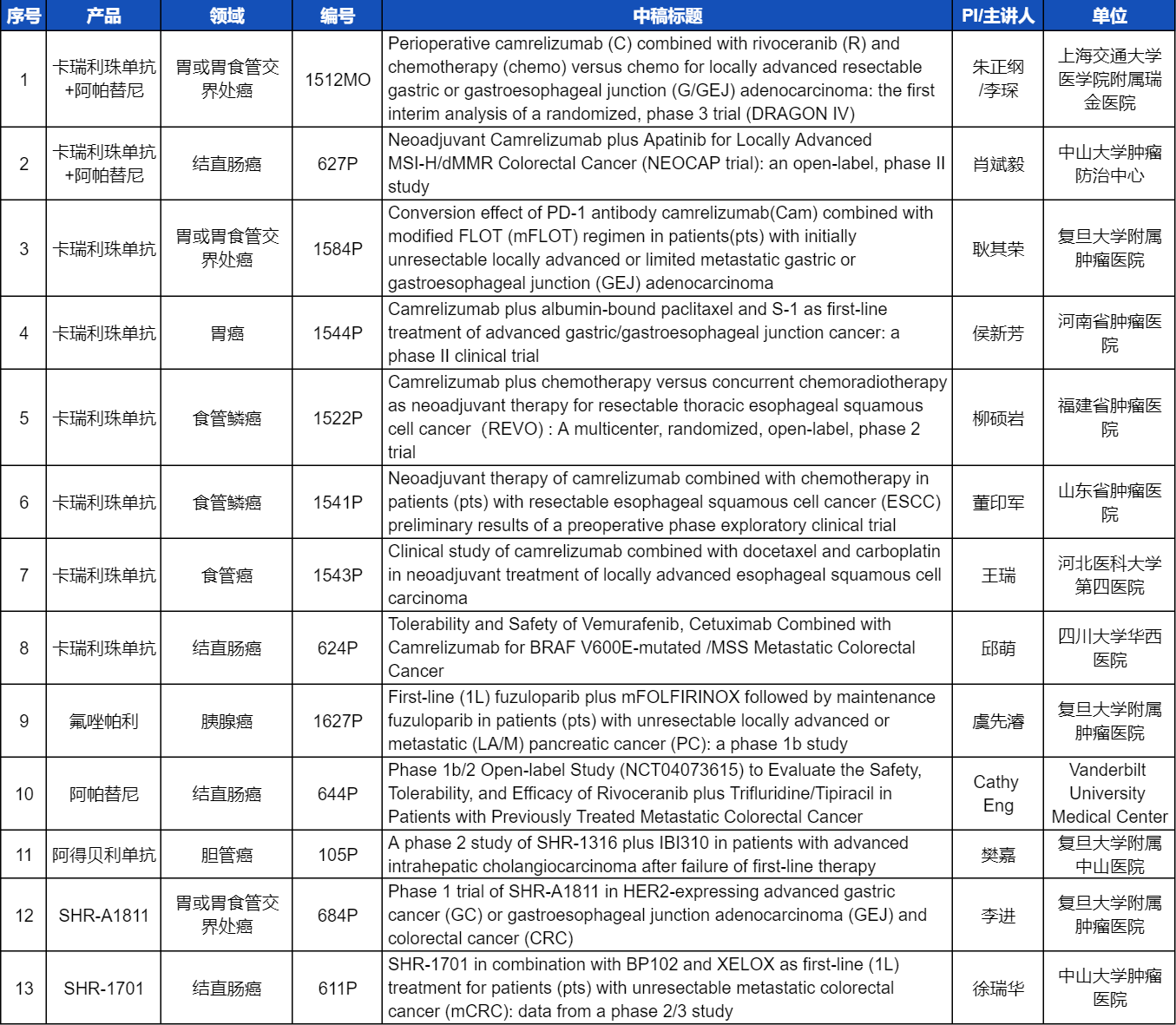 本次ESMO大会,将由中山大学肿瘤医院徐瑞华教授、广东省人民医院周清教授、中山大学孙逸仙纪念医院姚和瑞教授、上海交通大学医学院附属瑞金医院李琛教授分别就4项利来w66国际医药创新产品相关研究做口头报告,包括SHR-1701、SHR-A2009、SHR-A1811这3款未上市创新产品的实体瘤治疗临床研究,以及1项“双艾”组合(卡瑞利珠单抗联合阿帕替尼)治疗局部晚期可切除胃/胃食管交界处癌的Ⅲ期临床试验期中分析。