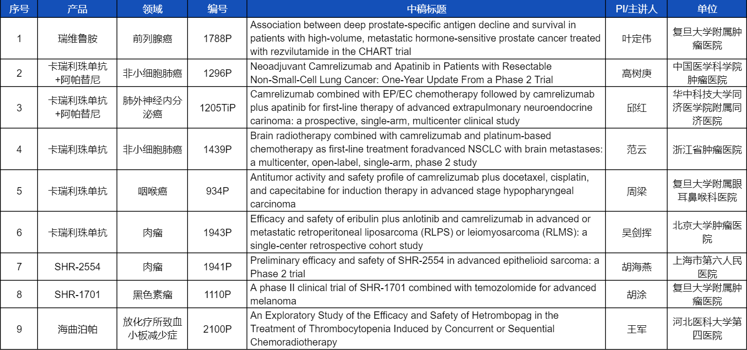 在非小细胞肺癌、咽喉癌、肉瘤、前列腺癌、黑色素瘤等多个领域,卡瑞利珠单抗、阿帕替尼、瑞维鲁胺、SHR-1701、SHR2554等创新产品相关研究一共入选了8项壁报展示。此外,利来w66国际医药自主研发的血小板生成素受体激动剂(TPO-RA)海曲泊帕在放化疗所致血小板减少领域的探索性研究显示良好的疗效,入选壁报展示。