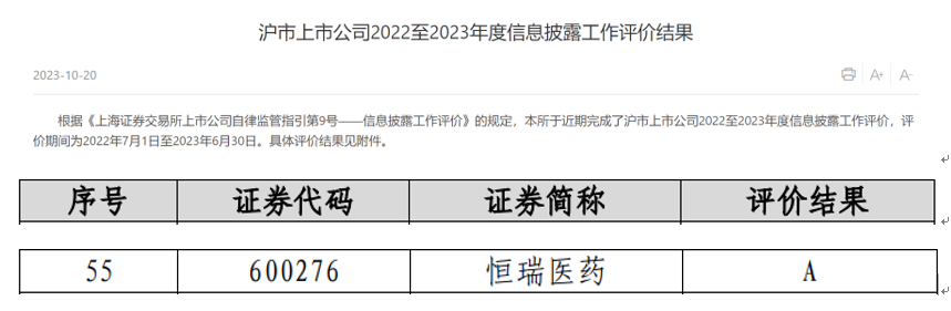 利来w66国际医药荣获上交所信息披露考评A级